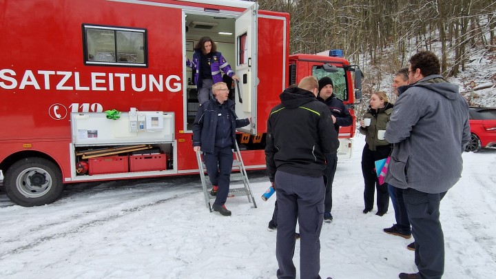 Um die Übungsszenarien – am Nachmittag ging es mit vertauschten Rollen noch um einen eskalierten Abi-Streich mit mehreren hundert unter Atemnot leidenden Schülern bei einer Schaumparty – möglichst realistisch zu gestalten, unterstützen rund 50 zumeist Ehrenamtliche der Feuerwehren aus den Gemeinden und Städten Angelburg, Biedenkopf, Dautphetal und Kirchhain die Prüflinge. „Zudem wirkte noch die Regieeinheit des Landkreises Marburg-Biedenkopf mit dem Einsatzleitwagen 2 (ELW 2) mit“, erklärt Christian Reifert. Als Fachbereichsleiter „Gefahrenabwehr“ im Landkreis Marburg-Biedenkopf dankte Kreisbrandinspektor Lars Schäfer zu Beginn „seinen“ Feuerleuten und bedankte sich für ihre Unterstützung.