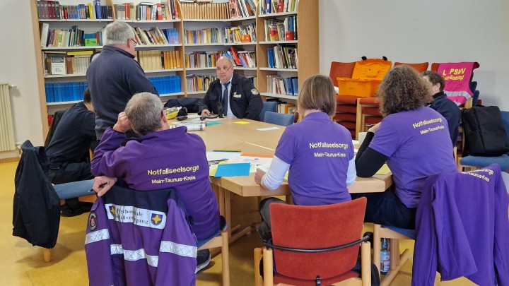 In den Stäben entwickeln sich die Szenarien mitunter in verschiedene Richtungen. In einem Stab bekommen die Notfallseelsorger die Info, der verletzte Hausmeister sei verstorben, im anderen, dass er reanimiert worden sei. Entsprechend unterschiedlich fällt die Reaktion der PSNV-Leitungskräfte aus, wie später in der Abschlussbesprechung deutlich wird. Dort lobten die Beobachter die professionelle und kompetente Zusammenarbeit der durchweg hochengagierten Beteiligten. Dass in der Kommunikation zwischen Regie, Technischer Einsatzleitung und PSNV nicht alles reibungslos lief, sei der „Übungskünstlichkeit“ und der unterschiedlichen Szenarieneinfindung geschuldet, urteilten die Prüfer.