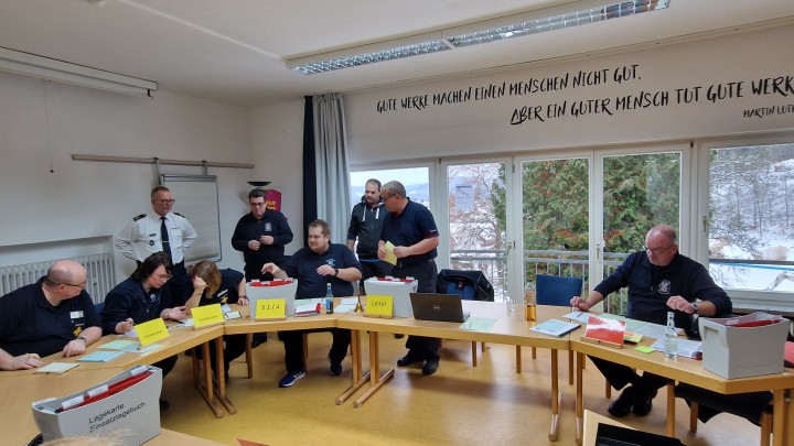 „Die Kandidaten sind wie später in der Realität entweder als Fachberater in der Technischen Einsatzleitung oder Katastrophen- und Krisenstäben eingesetzt oder als Leitungskräfte der PSNV“, erläutert Reifert: „Sie arbeiten dann in Technischen Einsatzleitungen im Themenfeld der PSNV mit.“ In Holzhausen tun sie das für ihre Prüfung unabhängig voneinander in zwei Gruppen, den Stäben „Grün“ und „Blau“.