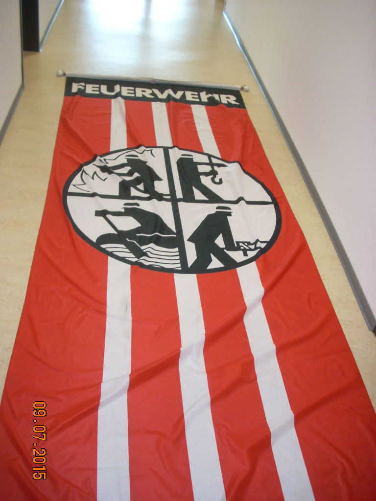 Fahne mit Schriftzug "Feuerwehr" und Logo "retten-schützen-bergen-löschen" Höhe 400 cm, Breite 95 cm